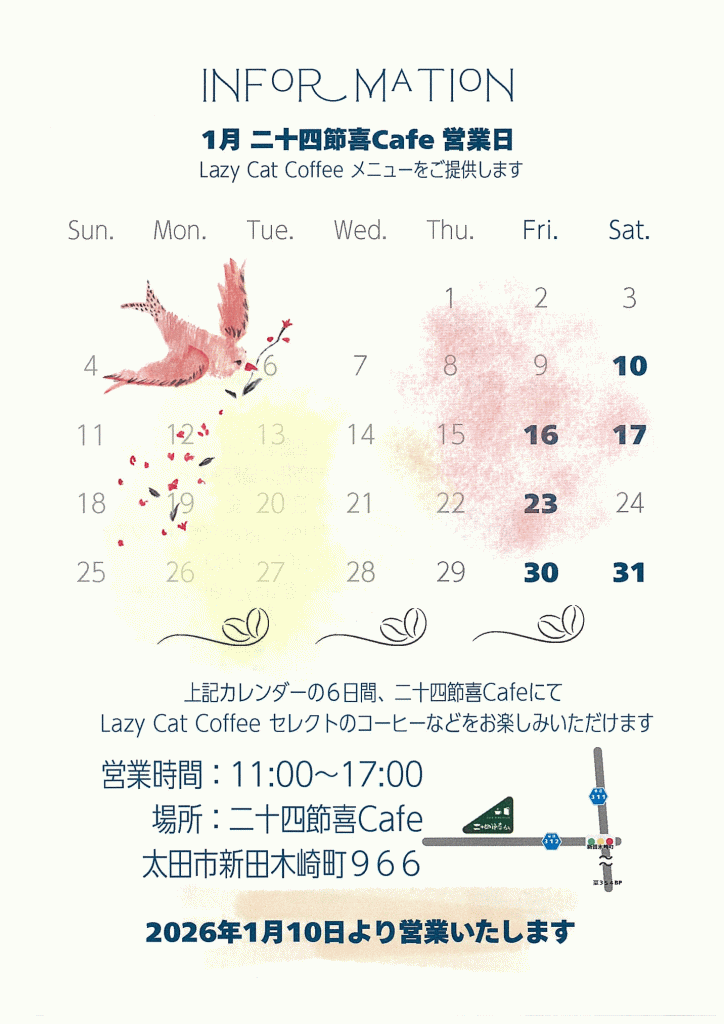 今月は金・土(24日は休み)のみ営業、2月以降は木・金・土曜日を営業日とする予定です。